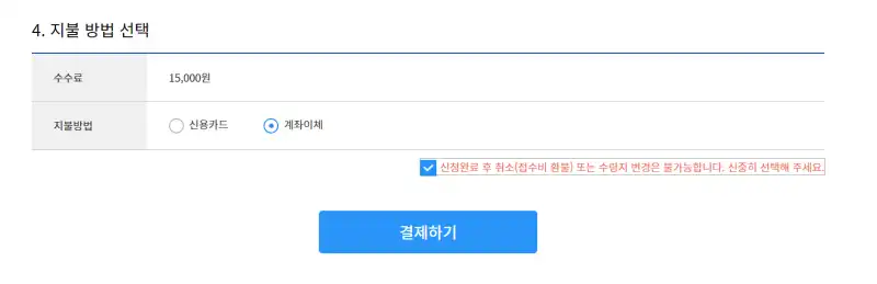 온라인으로 재발급 시 결제까지 마쳐야만 신청이 완료되기 때문에 수수료도 미리 준비하셔야만 합니다.