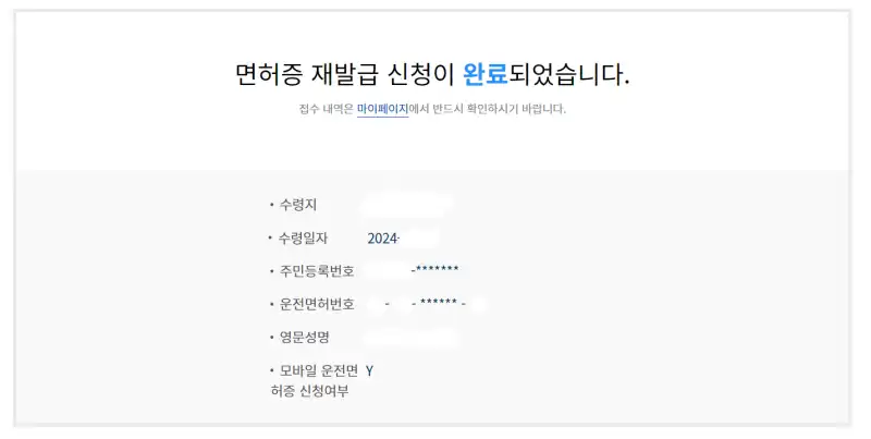 결제를 끝내고 나면 재발급 신청이 완료됐다는 화면과 함께 신청한 정보를 알려주니 마지막으로 잘 읽어보시길 바랍니다.