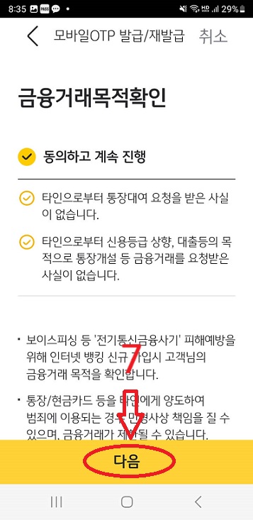 금융거래목적확인에 동의하고 계속 진행에 체크하시고 다음을 클릭하시면 신분증 촬영 안내 화면이 나옵니다.